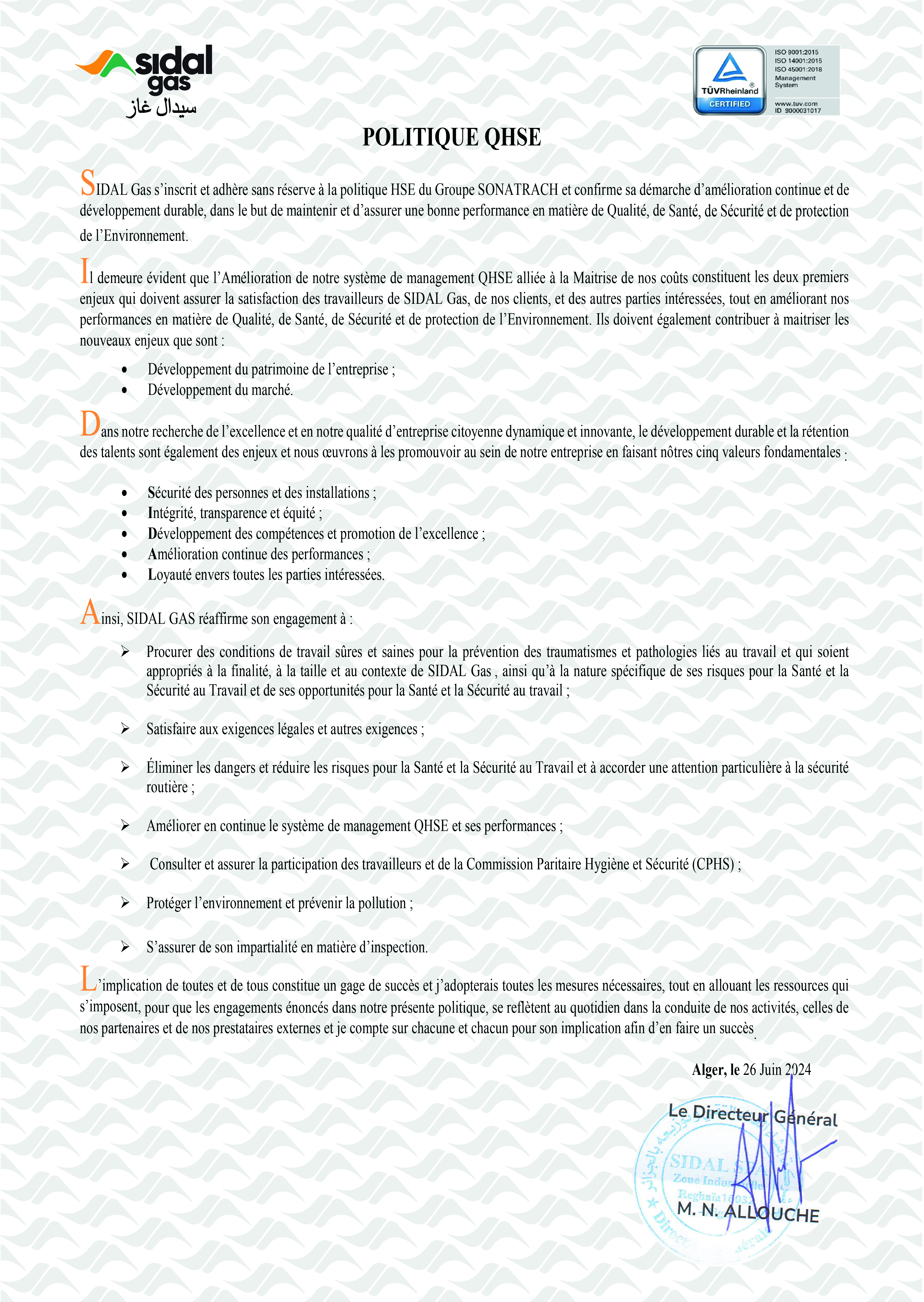 La politique Santé, Sécurité et Environnement de Sidal gas est mise à la disposition du public et à toute personne travaillant ou pour le compte de notre société.