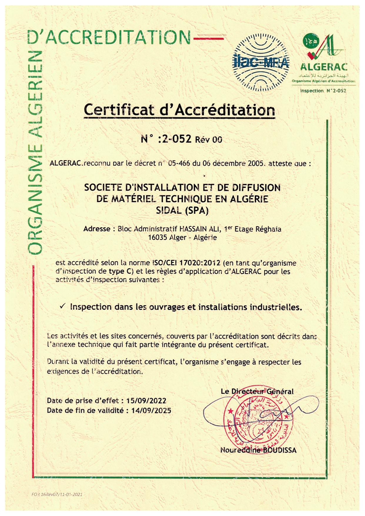 CERTIFICAT ISO 17020, Sidal gas a été accrédité selon le référentiel ISO /CEI 17020 vs 2012 par l’organisme ALGERAC le 15/09/2022